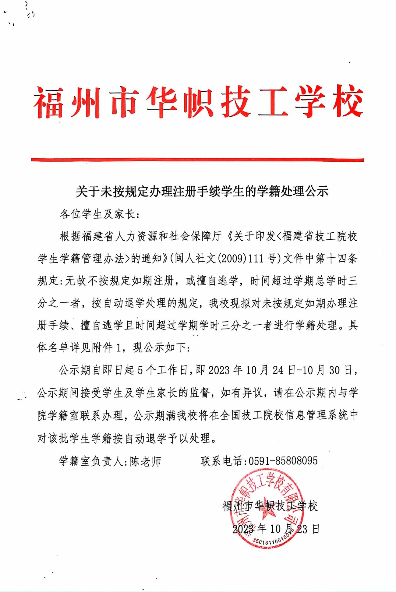 华帜技工 通知公告 关于未按规定办理注册手续学生的学籍处理公示