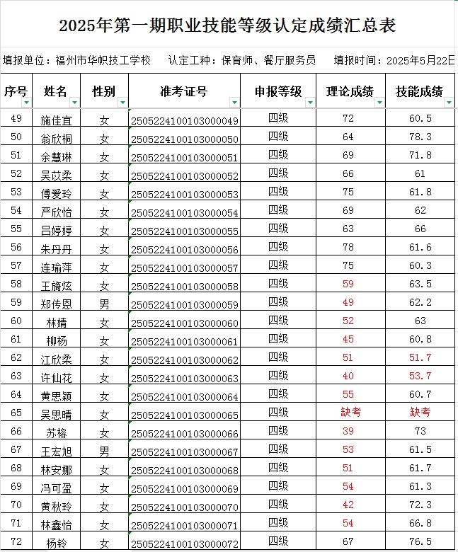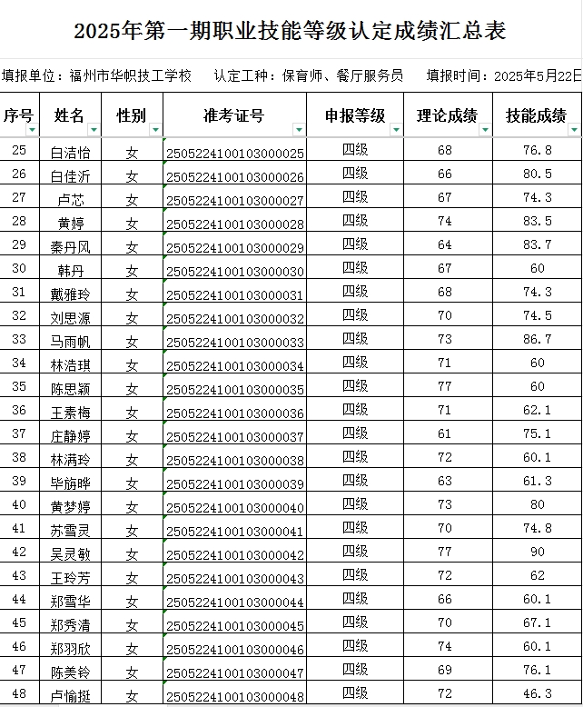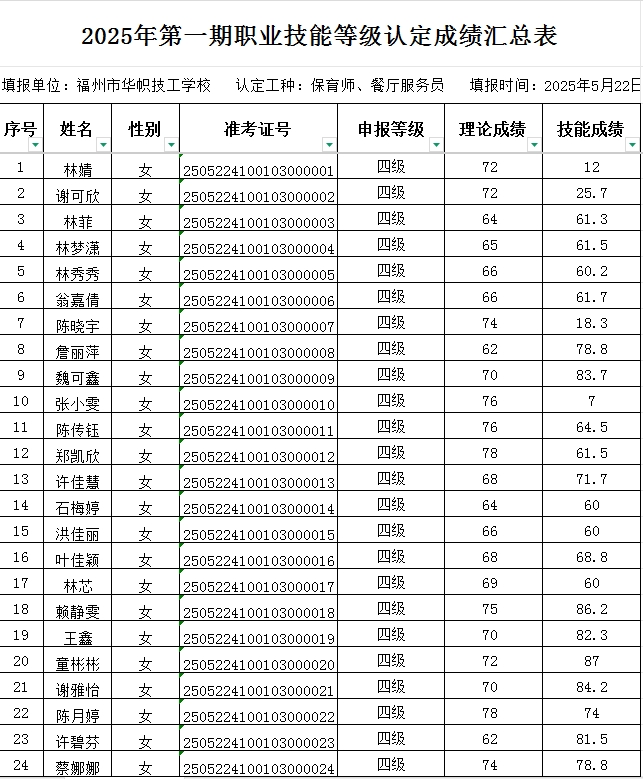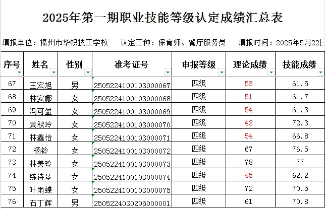 根据《福建省职业技能等级认定考务实施办法(试行)》(闽劳鉴〔2020〕22号)文件要求,我机构对2025年第一期保育师四级(林婧)、餐厅服务员四级(石丁辉)等共计76人的职业技能等级认定成绩予以公示。公示期为:2025年5月26日至2025年6月3日。公示期间,如有异议请来电福州市华帜技工学校反映,咨询电话:18850373016,监督电话:13960909652。