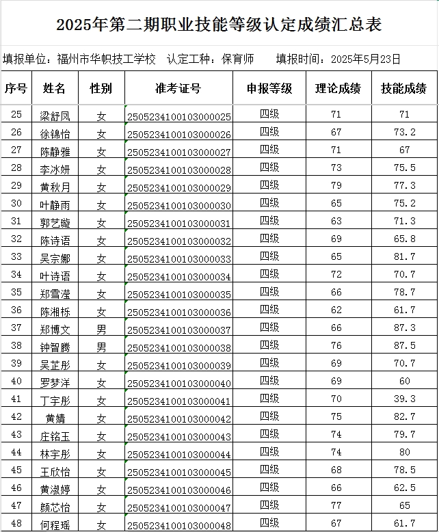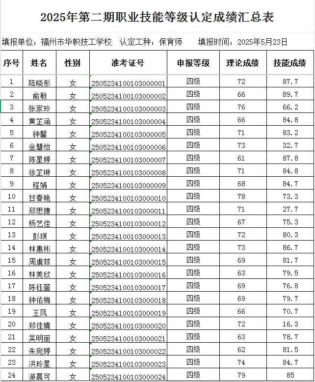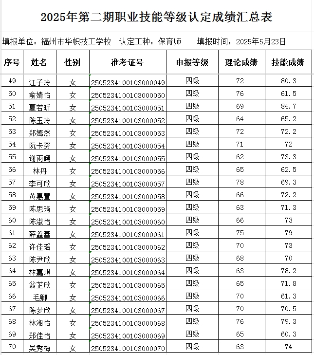 根据《福建省职业技能等级认定考务实施办法(试行)》(闽劳鉴〔2020〕22号)文件要求,我机构对2025年第二期保育师四级(陆晓彤)等共计70人的职业技能等级认定成绩予以公示。公示期为:2025年5月26日至2025年6月3日。公示期间,如有异议请来电福州市华帜技工学校反映,咨询电话:18850373016,监督电话:13960909652。